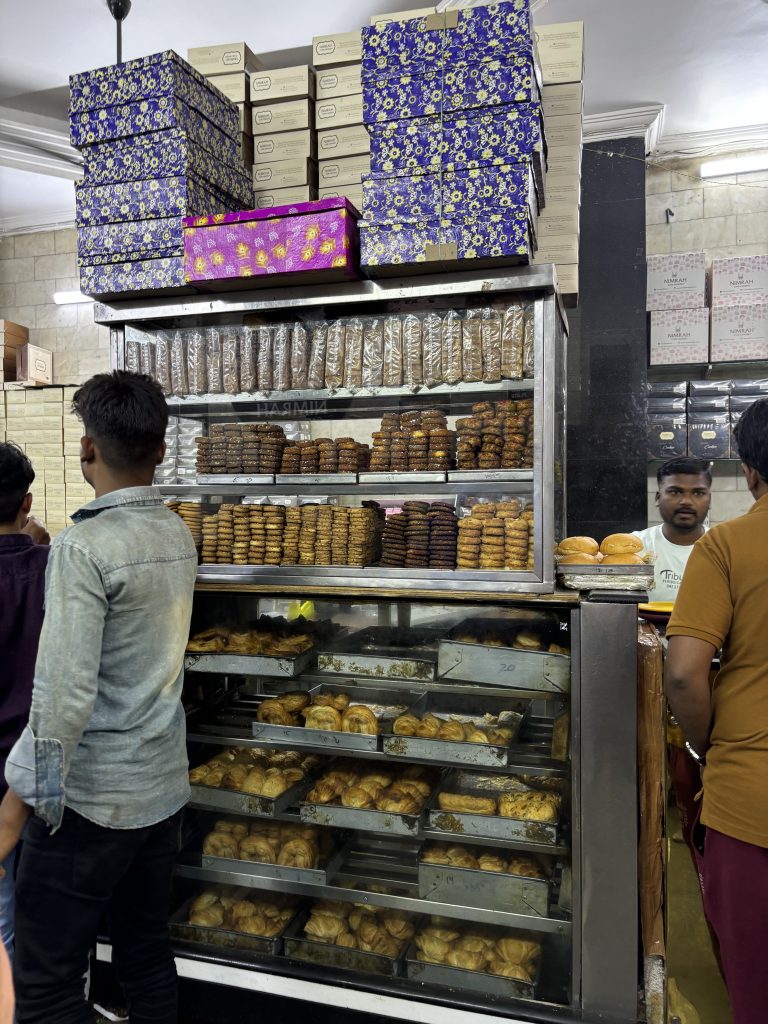 In Hyderabad spielt Essen eine zentrale Rolle. Neben den Restaurants und Cafés war für mich ein Marktbesuch ein unvergessliches Erlebnis: Zwischen Gewürzen, Stoffen und bunten Ständen entdeckte ich ein kleines Café, in dem es frisch gebackene Kekse und heißen Chai-Tee gab. Der Duft von Kardamom, Zimt und Ingwer war überwältigend und bleibt für mich mit Hyderabad verbunden. Wann immer ich dort bin, muss eine kleine Kiste Kekse mit nach Deutschland.