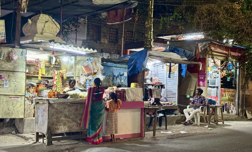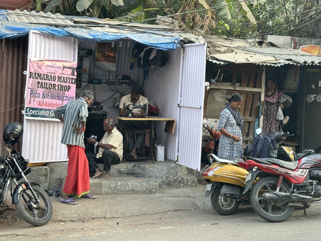 Doch fast noch eindrucksvoller war für mich das Straßenleben in der Umgebung meines Hotels. Überall sind kleine offene Geschäfte: Schuster, die Schuhe reparieren, Schneider mit alten Tretnähmaschinen, Friseure, die ihre Arbeit auf offener Straße verrichten. Mopeds fahren dicht an einem vorbei, oft sitzen die Damen im Sari elegant hinten auf – wie hübsch! Das Leben spielt sich draußen ab, laut, bunt und voller Energie.