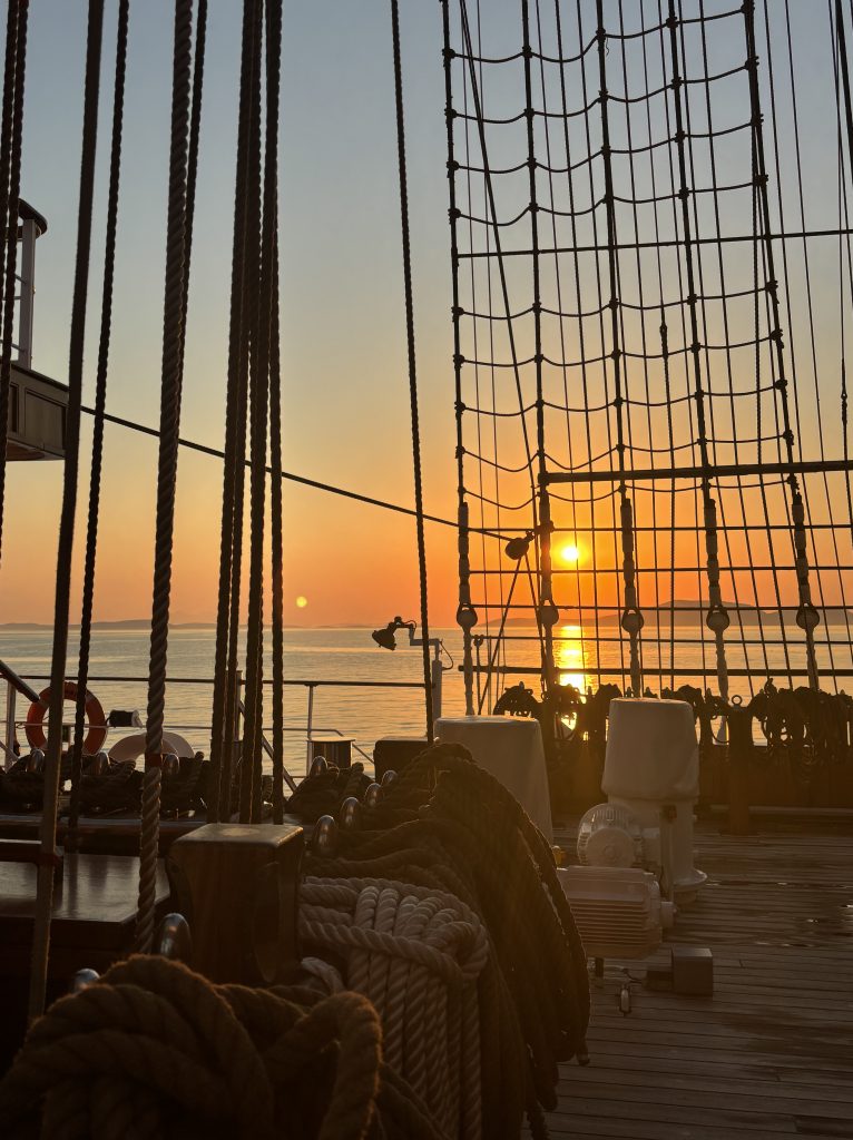 Es sind diese Augenblicke, die man nicht vergisst: Der Moment, wenn die Crew die Segel setzt und das Schiff lautlos Fahrt aufnimmt. Auf einen der zahlreichen Teakholzliegen zu ruhen und dem Geschehen zu zuschauen….wunderbar!